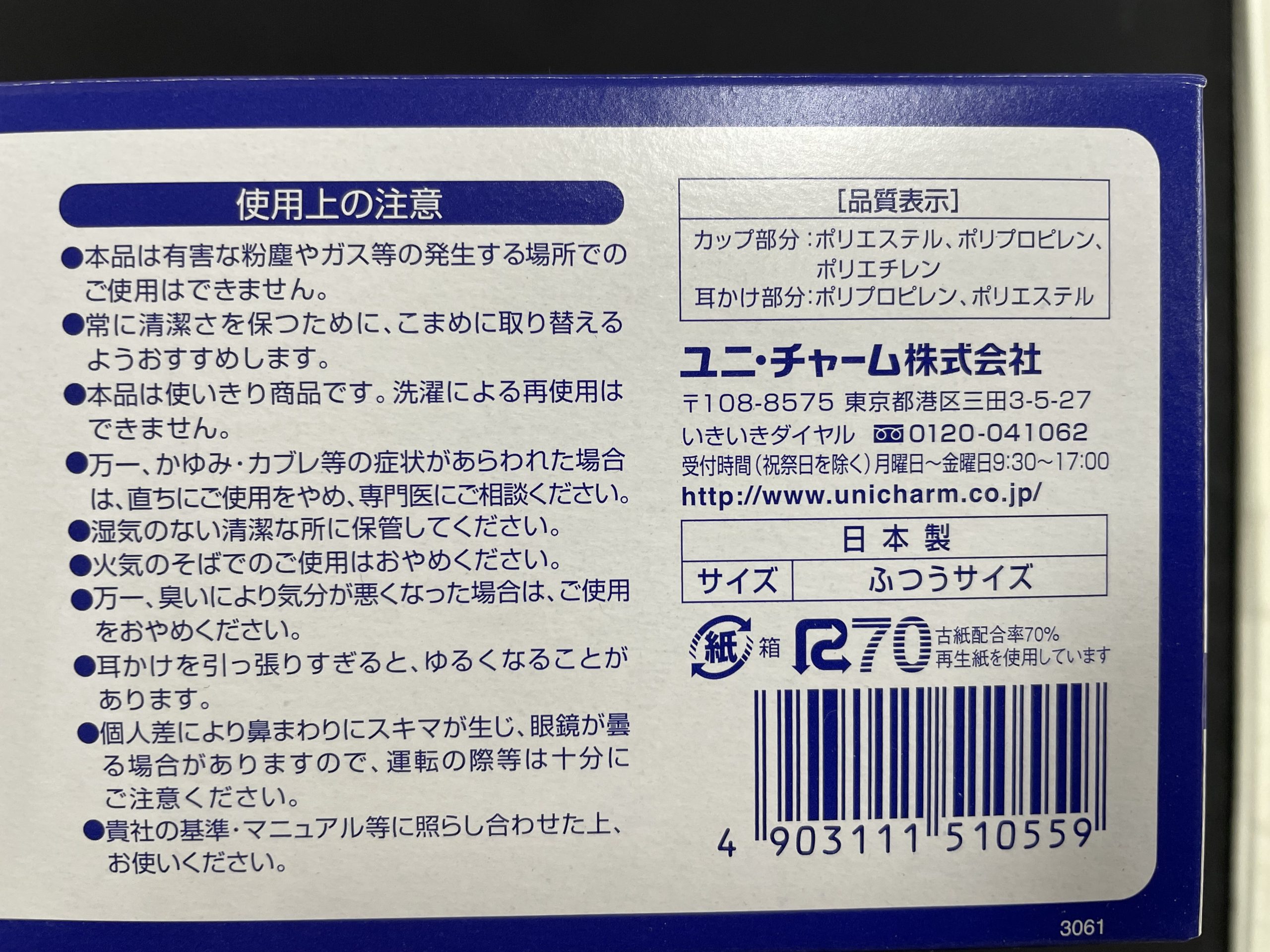 ●捕集効率 99.1%(試験粒子3~5μm 試験流量2.83L/分) ●構造 3層 不織布(ポリプロピレン ポリエチレン) ノーズブリッジ/樹脂製 耳掛ひも/丸ゴム ●大きさ 91×174mm 3段プリーツ ●入数 50枚/箱