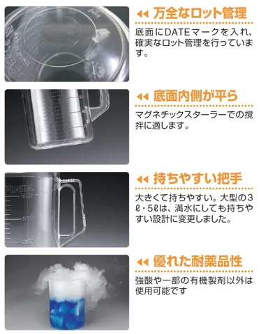 100ml 耐熱性・耐薬品性に優れたプラスチック製の透明ビーカー。オートクレーブ可能。便利な取手付。