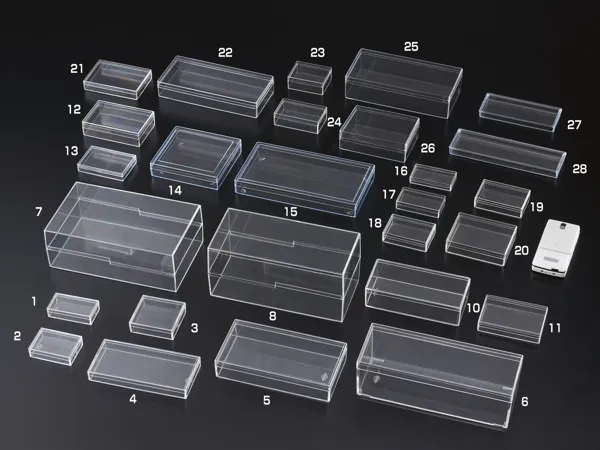 材質はポリスチレンPSで半導体部品や基盤・チップなどの移送や各種サンプルケースとして最適です。