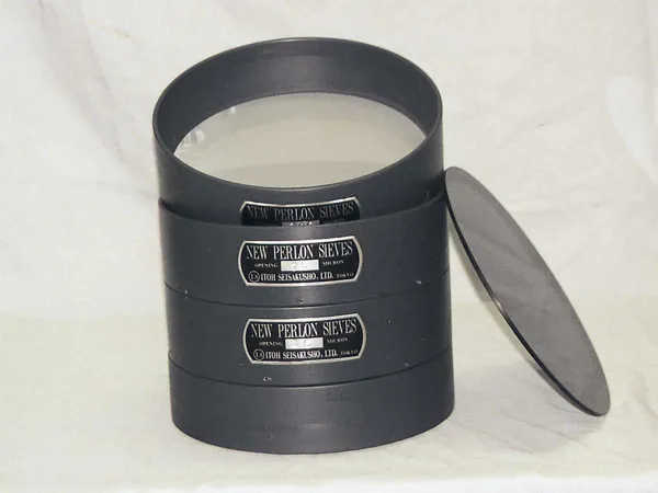| 網はナイロン製で、網目はJIS規格に準じて製作されています。枠の材質はポリプロピレン樹脂を使用していますので、試料に金属粉などによる不純物の混入がありません。 |