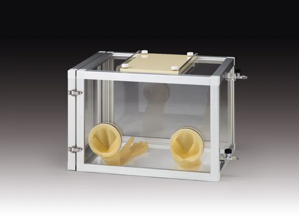 本体部分にアルミフレーム枠を使用した軽量な透明アクリル製グローブボックス(板部分はオールアクリル製)。ガス置換やドライエアー導入可能なバルブ装備。