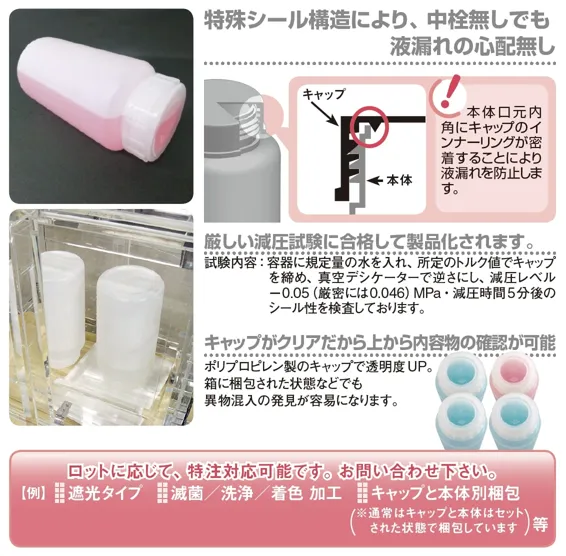 - PE細口瓶100ml以下の材質は、本体・高密度ポリエチレン、キャップ・ポリプロピレンとなっております。100ml以上の容量の場合ですと、本体・高密度ポリエチレン、キャップ・高密度ポリエチレン、中栓・低密度ポリエチレンとなります。